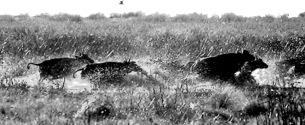 Back in Matusadona and shot in black & white this time, here’s a group of buffalo – which I’d accidentally disturbed – at full escape velocity across an area of semi-flooded foreshore grassland. This was in 1978 or 79, and I can’t recall the actual time of year, but it certainly looks very different to the scene today: