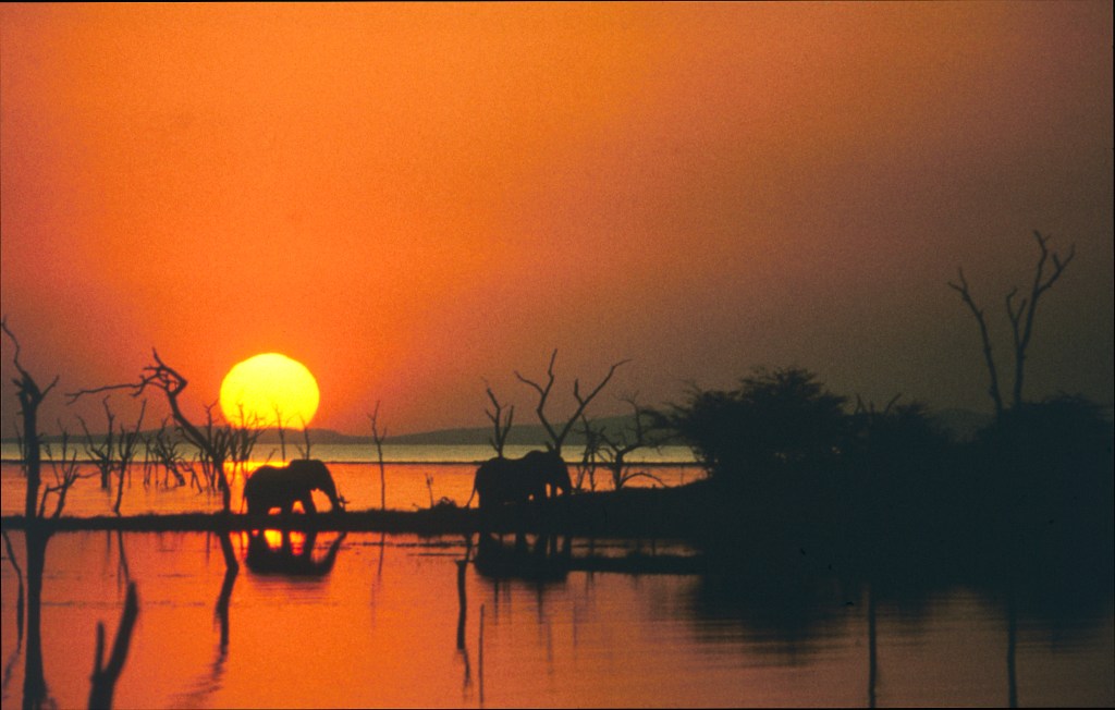 Each of these experiences catalysed its own revelation: the Mana fort, that of the sheer dedication of Parks staff to the cause they served; the Matusadona treehouse, to the insignificance of man in the face of natural forces, when a thunderstorm and gale force winds struck at 2a.m. Lake Kariba was full in 1980, when I took the two photos below, somewhere on the north shore of Matusadona’s Palm Bay: