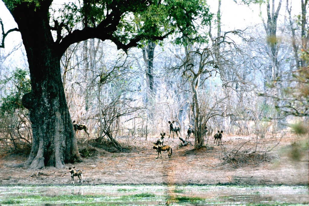 This slide – of wild dog, painted wolves, whatever your preferred terminology – hasn’t survived quite as well as most, but was taken at Mana’s Sapi No. 1 pan in 1979: